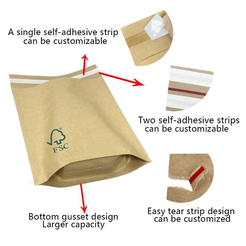 Ciri: Biodegradable Kraft Paper Mailer Prestasi kalis air yang baik, tidak lagi takut pada hari -hari hujan; Penggunaan pelekat super, memusnahkan pengedap getah, melindungi privasi, privasi adalah baik.